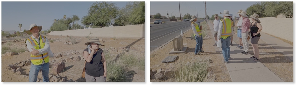 October featured two field trips, one to Honeybee Canyon, in the Tortalita Mountains, and the other in Oro Valley and Oracle, led by Chuck LeFevre of Common Sense Passive Water Harvesting. The tour included touring water harvesting landscapes along roadways, public common areas, and both small and large front yards that employed berms, a rock dam, and other passive-water harvest projects.