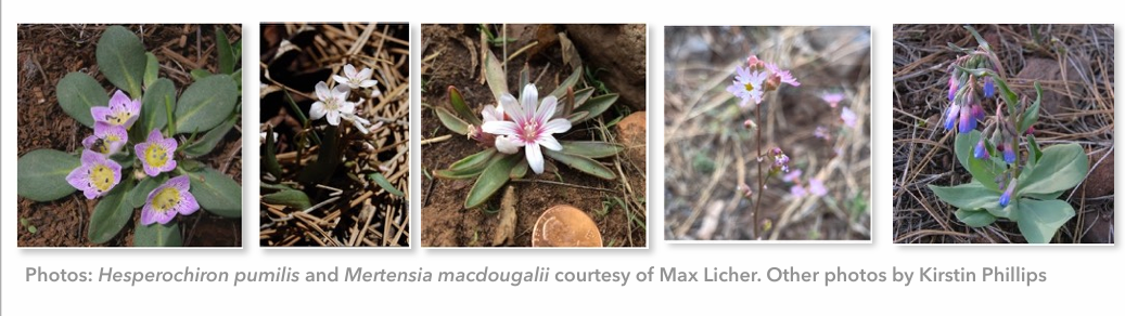 Tentative Date: Saturday, May 9 This is an easy 2.5 mile hike near Mormon Lake. We’ll be looking for early spring bloomers like dwarf monkey fiddle (Hesperochiron pumilis), western springbeauty (Claytonia lanceolata), short-sepal bitterroot (Lewisia brachycalyx), slender woodland star (Lithophragma tenellum), and Macdougal’s bluebells (Mertensia macdougalii). Contact Kirstin at flagstaffAZNPS@gmail.com if you are interested in joining. Photos: Hesperochiron pumilis and Mertensia macdougalii courtesy of Max Licher. Other photos by Kirstin Phillips